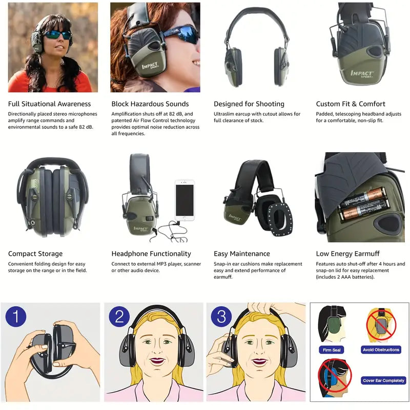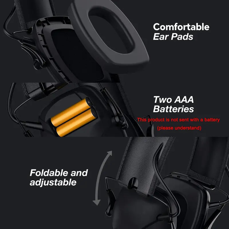 **Features low profile earcups for firearm stock clearance; adjustable headband for secure fit; compact folding design for convenient storage